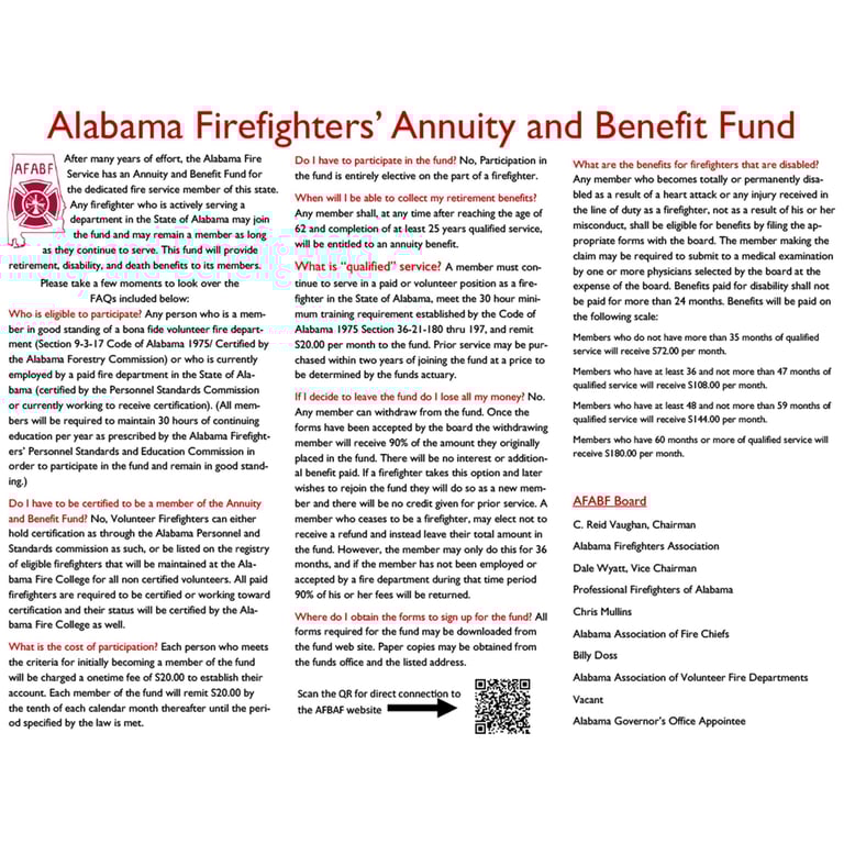 After many years of effort, the Alabama Fire Service has established an Annuity and Benefit fund for the dedicated fire service members of this state. Any firefighter who is actively serving a department in the State of Alabama may join the fund and may remain a member as long as they continue to serve. This fund will provide retirement, disability, and death benefits to its members. Please take a few moments to look over the FAQs included below: